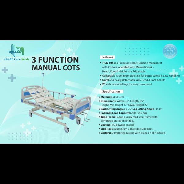 A 3-function cot with mattress, also known as a hospital bed, has three adjustable section...